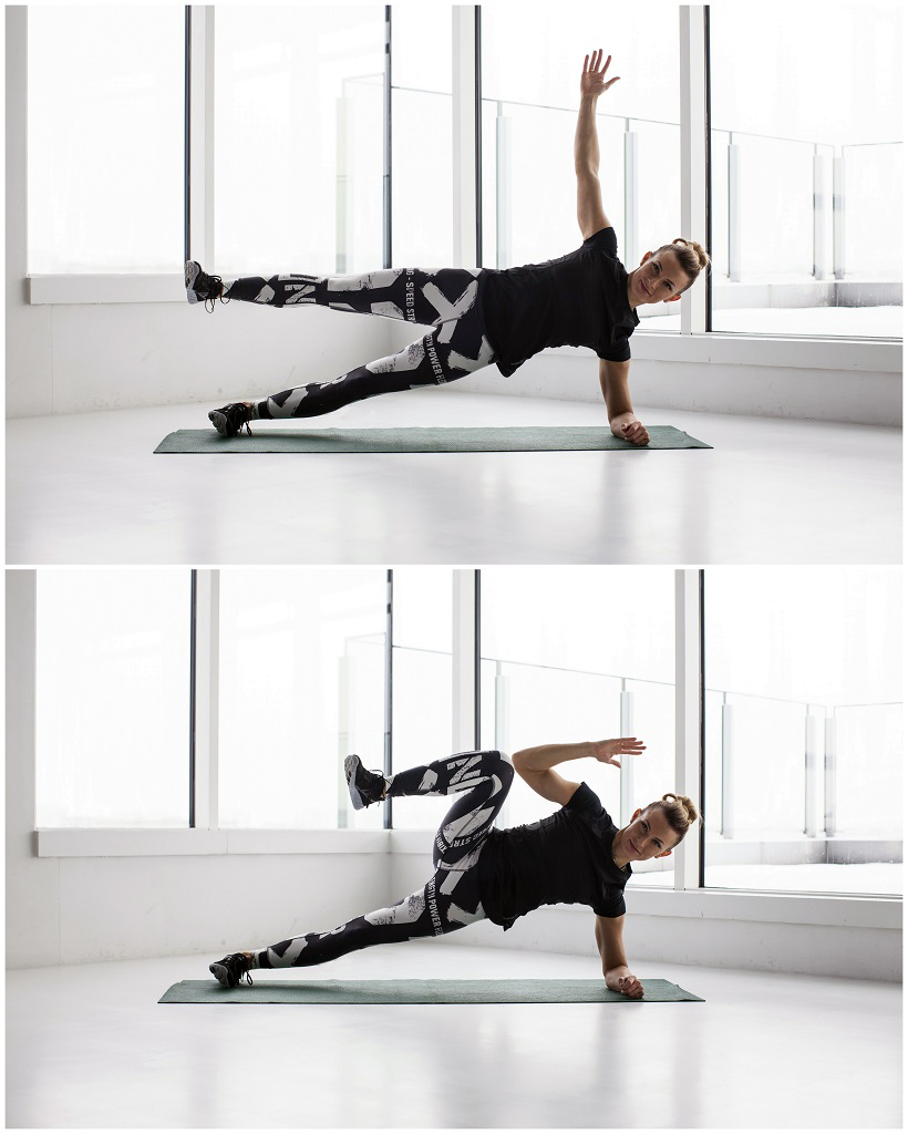 Ustaw się w podporze bokiem na przedramieniu. Łokieć powinien być w jednej linii z barkiem. Unieś górną nogę starając się utrzymać tułów prosto (biodra nie mogą opadać w dół). Jeśli dasz radę – ugnij górną nogę i przyciągnij kolano do łokcia. Łatwiejszą wersją tego ćwiczenia jest postawienie dolnej nogi na ugiętej w kolanie w kodze (kolano dotyka podłoża).