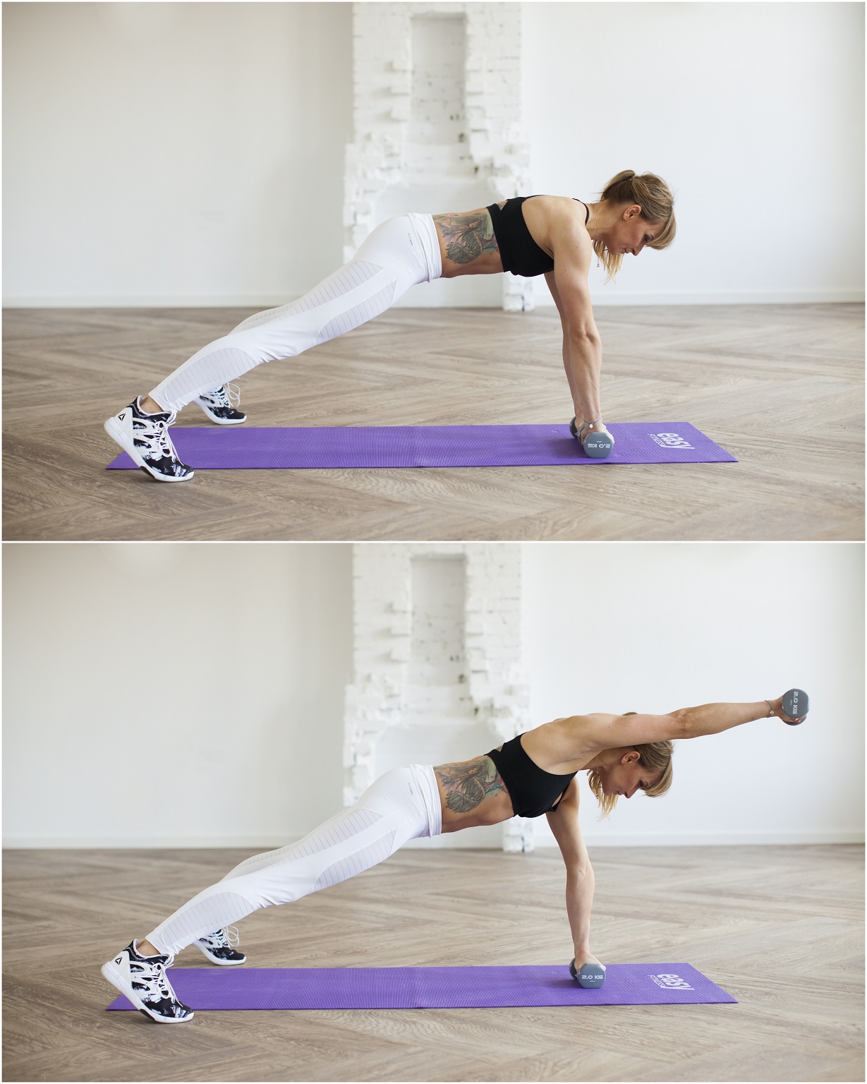 Ustaw się w podporze przodem na prostych rękach – trzymając hantle. Stopy ustaw szerzej niż mata, by łatwiej było łapać równowagę. Następnie, nie skręcając bioder na boki, unieś wyprostowane ramię w bok. Zatrzymaj się w tej pozycji na 2 sekundy i zmień rękę.
